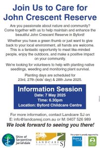 Come together with us to help maintain and enhance the beautiful John Crescent Reserve in Byford!